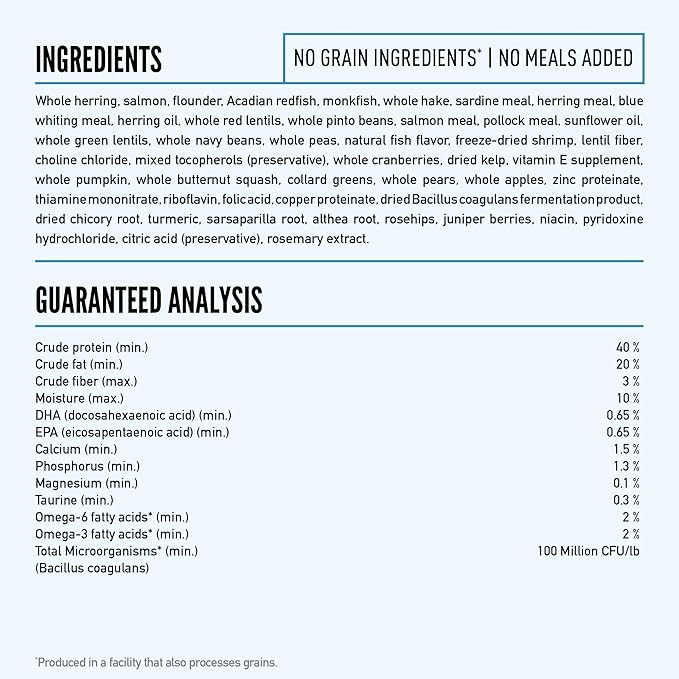 - The first 6 ingredients in this ORIJEN cat food are raw, including whole herring, salmon, flounder, Acadian redfish, monkfish and whole hake.