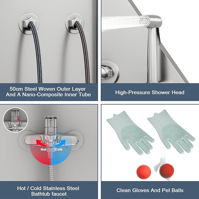- COMPREHENSIVE ACCESSORIES FOR EASY BATHING:Measuring 59.05" L x 27.55" W x 59.05" H, this dog wash sink with essential shower accessories,a versatile hot/cold faucet and a convenient water inlet,304 stainless steel shower head set, offering a comfortable bathing experience. Toy ball can soothe pets' nervous emotions.With dog bath brush and dog washing gloves tools to detangle fur, you can achieve a professional wash at home.