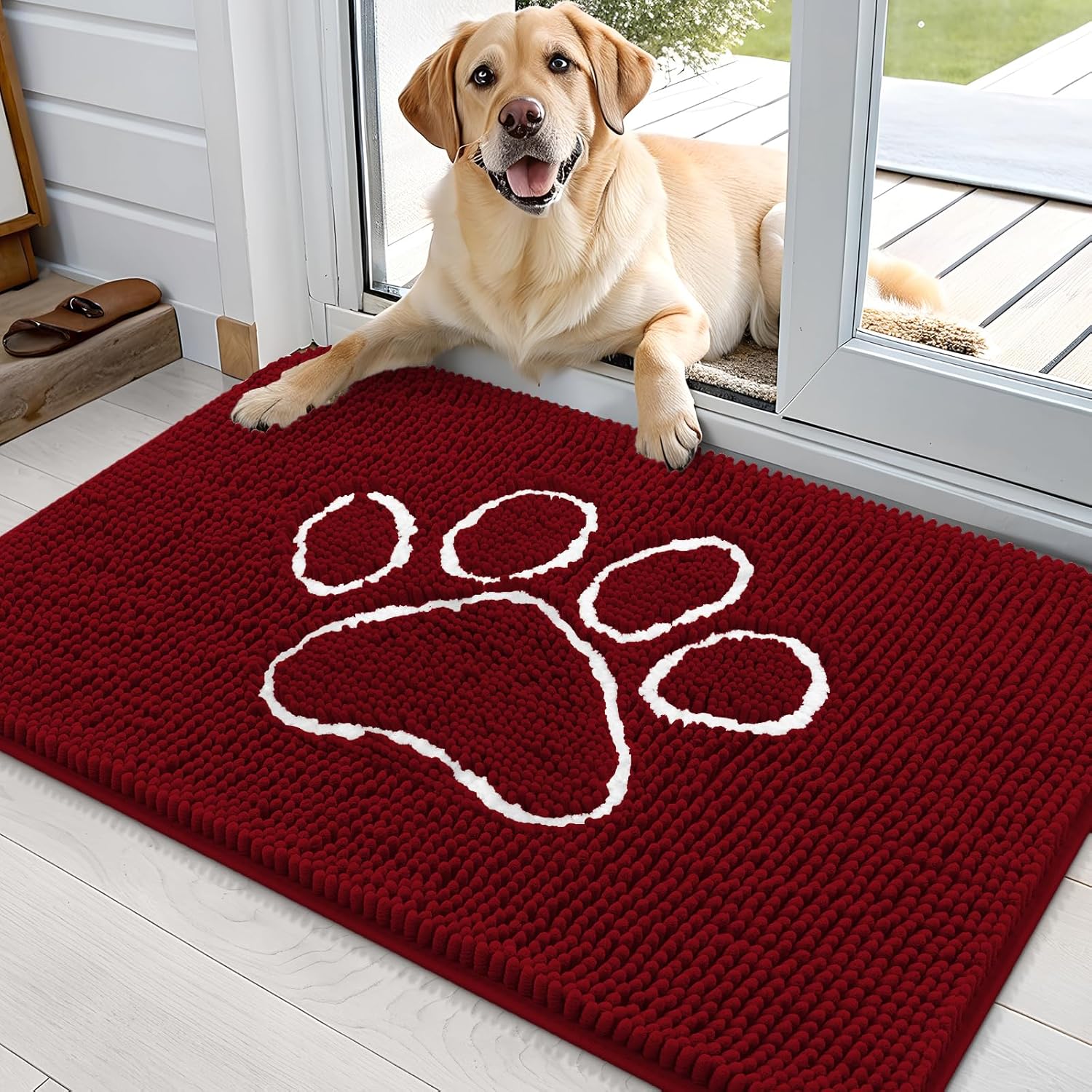 OLANLY Door Mat for Muddy Dog Paws 36x24, Ultra Absorbent Chenille Mud Doormat with Paw Print Design, Non-Slip Washable Doormat for Indoor Entryway, Quick-Dry Pet Bed Mats for Dirty Dogs, Red