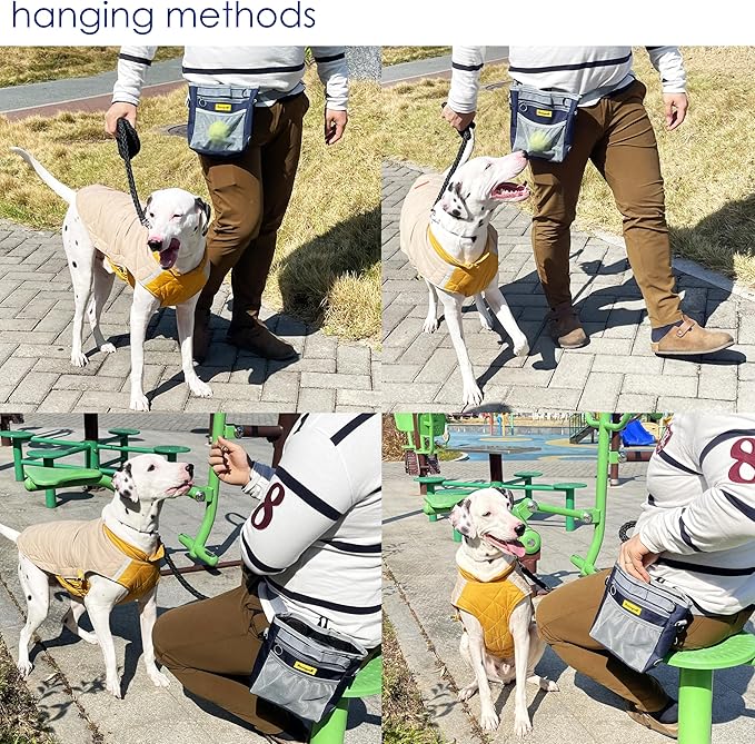 - 3.Enhanced Magnetic Closure: The bag features two sets of powerful magnets at the opening, ensuring automatic closure and preventing food from spilling, even when bending over. A convenient pull tab allows for one-handed opening when you need access to the contents of your dog treat pouch. The strong magnets make it a perfect solution for training and walking, ensuring your treats stay secure in the dog treats holder for training.