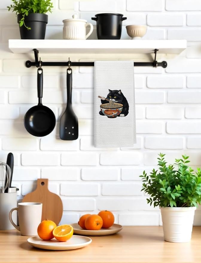 Black Cat Kitchen Hand Towels Bathroom Decor, Funny Japanese Noodle Cat Dish Towels Tea Towels for Kitchen,16x24 Inch