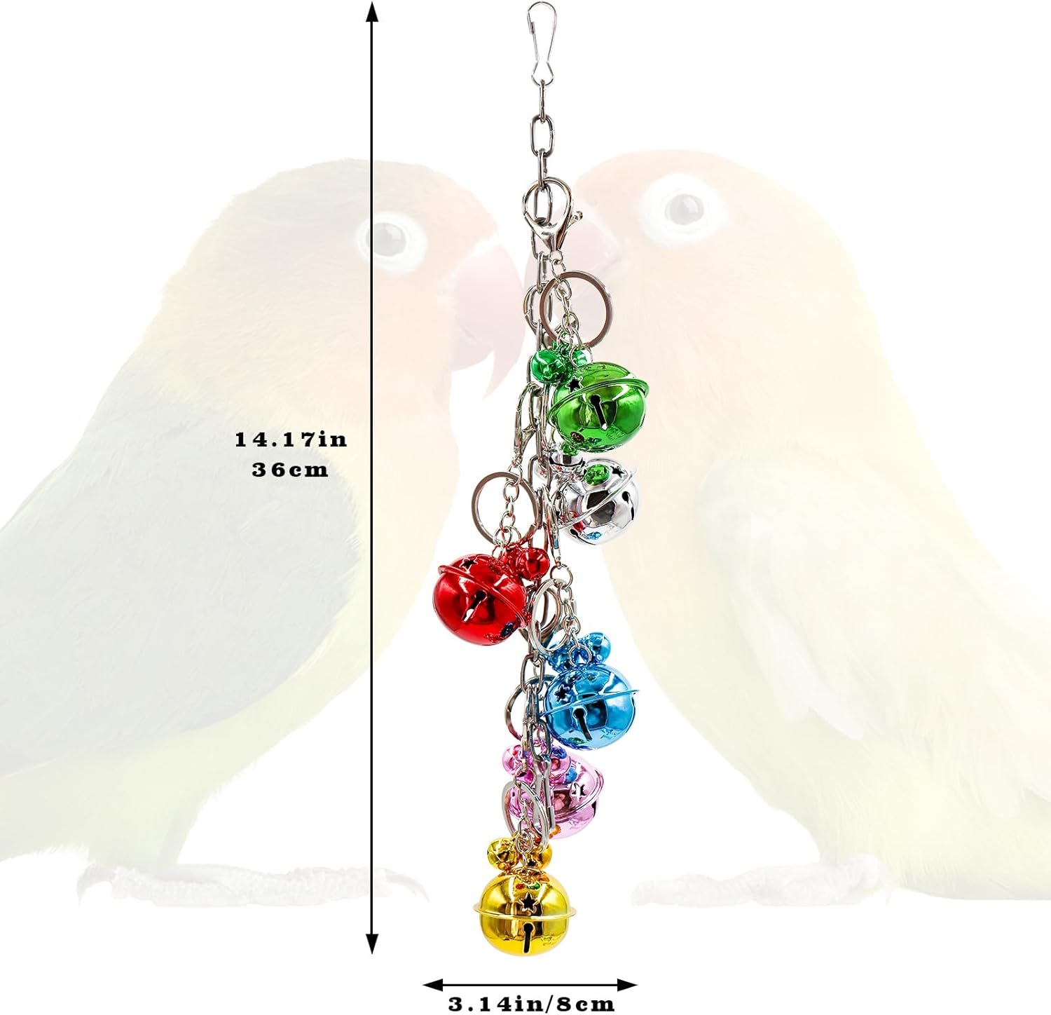 - Versatile Hanging Options: With metal hooks at both ends, these colorful bell toys offer multiple hanging methods. They can be hung vertically or separated to form a bird bell swing toy, allowing you to customize your bird’s play area according to their preferences.