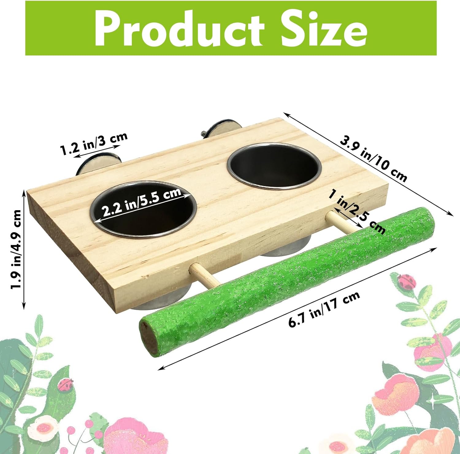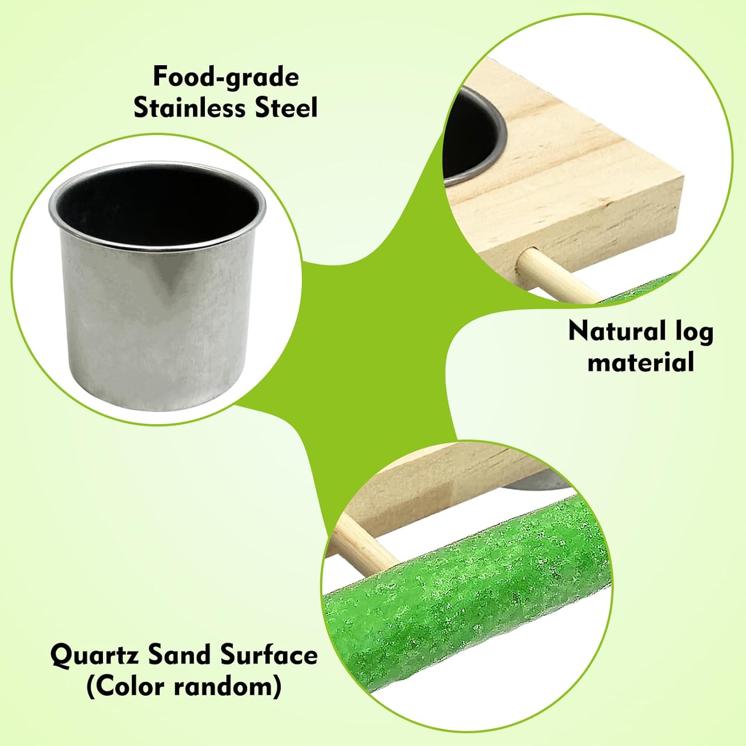 - PERCHING & CHEWING: In front of our bird food bowl is a wooden stick (color random); coated with quartz sand; which serves as an ideal surface for your pet to perch and eat or rest; naturally; thanks to our superior material choice; your pet can also peck at it when bored; offering an enjoyable activity that adds fun and aids in more effective beak and claw grinding