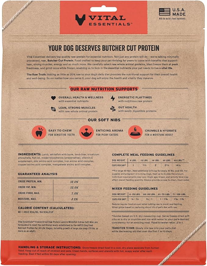 - SOFT NIBS FREEZE-DRIED RAW LAMB & WHITEFISH DOG FOOD: Vital Essentials Freeze Dried Soft Nibs Dog Food packs more protein than industry standard into every soft bite to deliver the peak vitality your dog deserves, especially when compared to dehydrated dog food. This complete and balanced freeze-dried raw dog food is made with responsibly sourced premium Butcher Cut lamb and whitefish.
