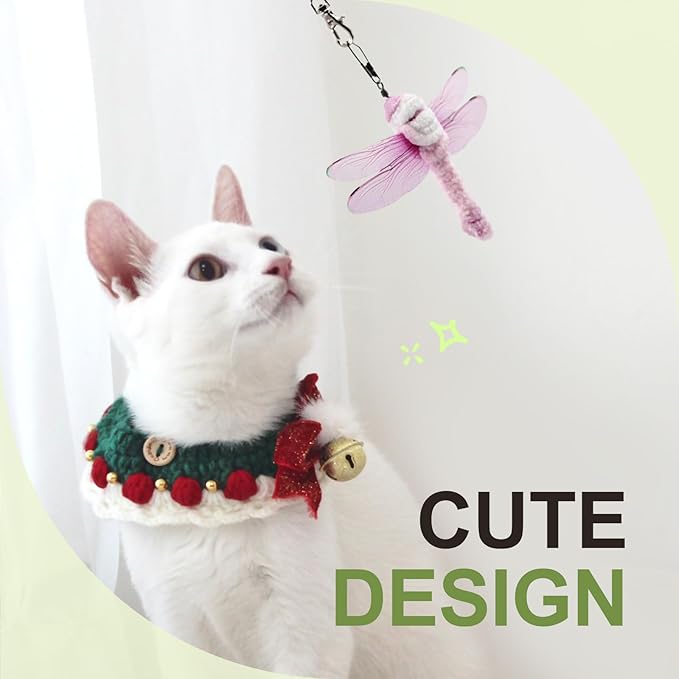 - [LIFELIKE INSECT DESIGN] The insect cat toys has soft fuzzy body with double nice wings. which can fly and dance like a real dragonfly when it moves on stick. Cats will love to swat, pounce and chase these dragonfly toys. In order to reduce the risk of cats swallowing accessories that fall off during play, these cat dragonfly toys are not equipped with bells. But we offer an additional 6 bells as a gift, which you can install by yourself if needed.
