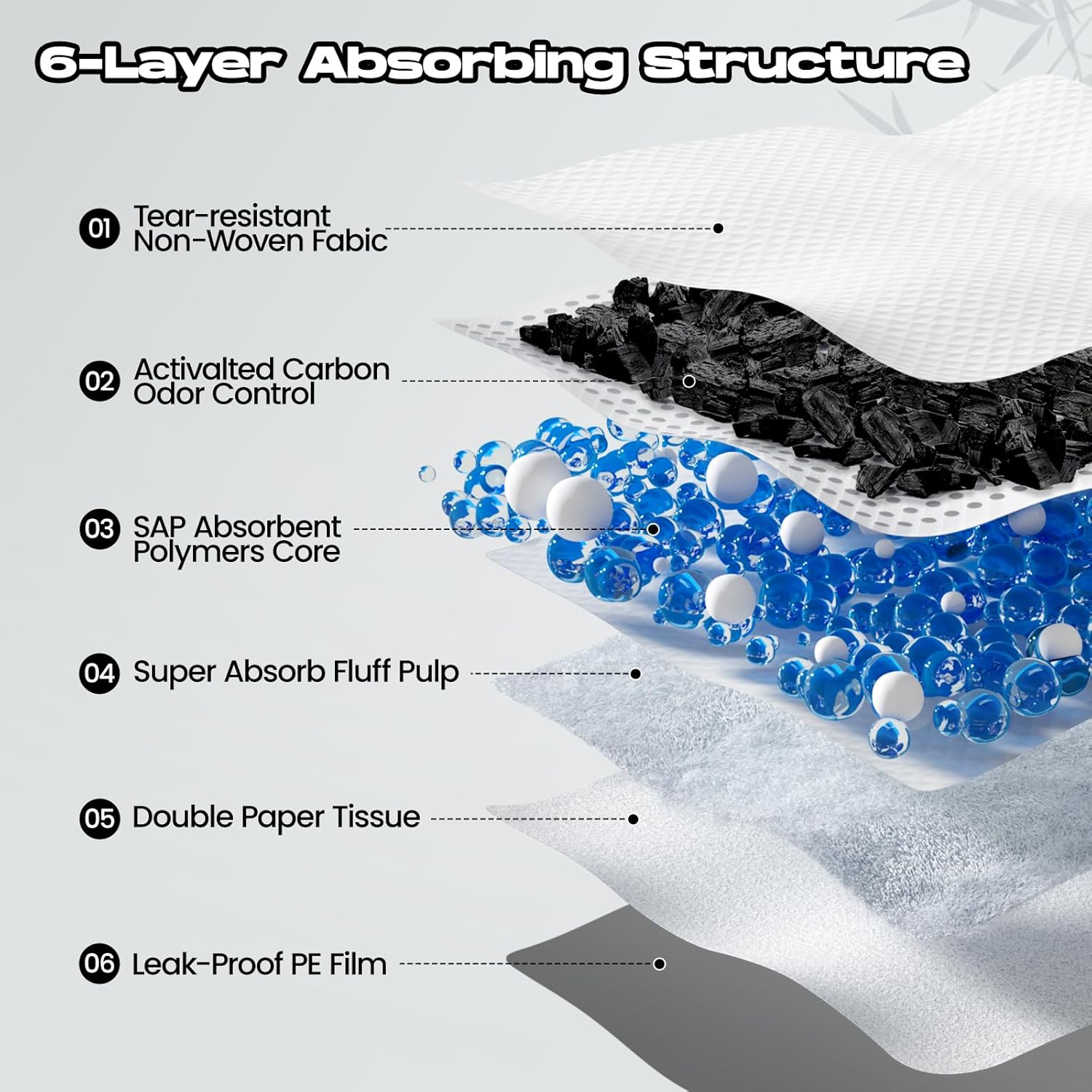 - 🦴【Super Absorbent & Quick Drying】6 layers of protection are designed with polymers for super absorbency, which converting liquid to gel in seconds for easy cleanup and staying dry. The non-woven fabric of the diaper pads accelerates liquid absorption and prevents reverse osmosis, which keeping the surface dry quickly
