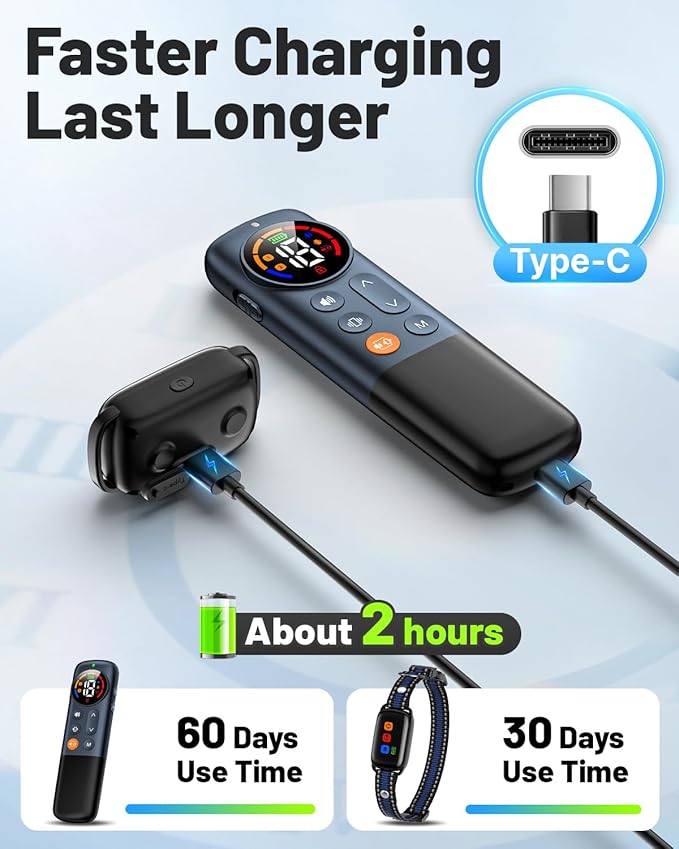 - 2 Hour Quick Charge - Battery life up to 30-60 days per full charged, avoiding the hassle of needing to recharge frequently. With 2 USB-C charging cables, easy to connect adapters with USB ports, e.g. mobile power, laptops, USB sockets. Type-C cables are highly replaceable and versatile. The rechargeable dog training collar with remote also contend power saving mode. No operation, enter power saving mode.