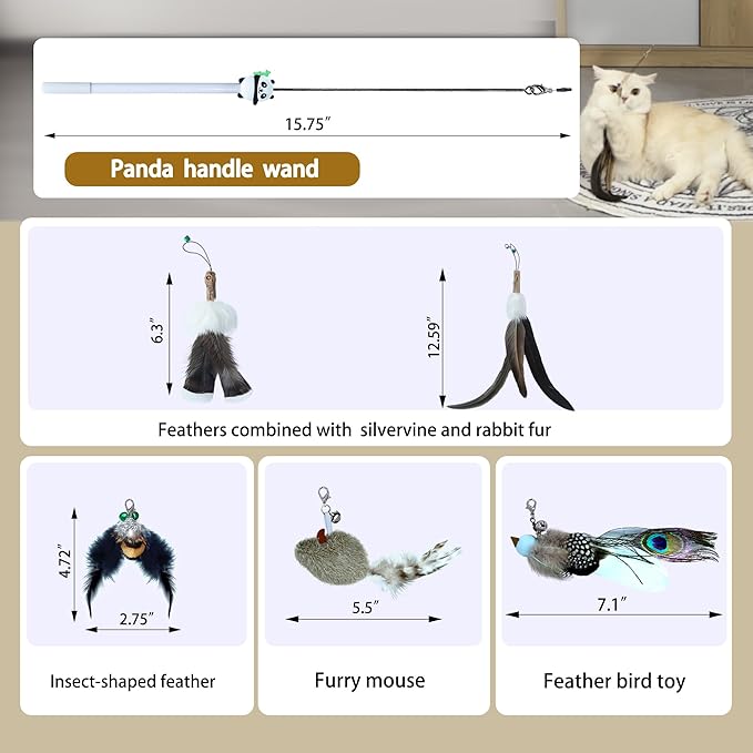 - 5 different cat wand feather refill and 1 fishing line. Cat feather refills come with bell and clasp for easy replacement.