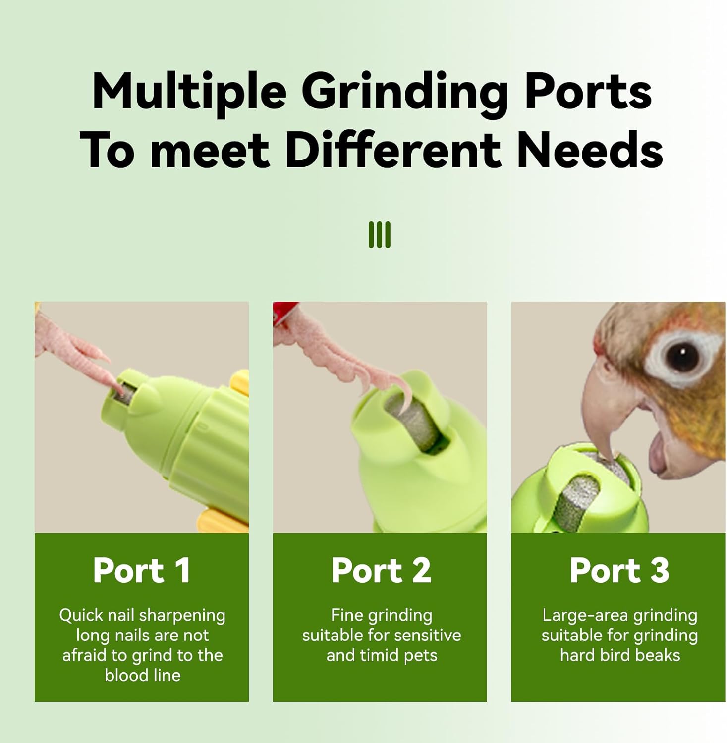 - Versatile Pet Nail Grinder for Birds, Cats & Dogs –— Our bird nail grinder multi-pet compatibility lets you switch ports and speeds to perfectly suit the nail hardness and size of parrots, conures, cockatiels, budgies, cats and small dogs