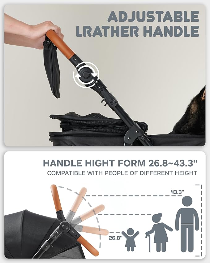 - 【Large Pet Jump in Easily: Zipper Foldable Mesh Pet Door】One side of the carrycot has a zippered mesh door(with foldable mesh curtain) to allow large pets jump in or out easier. Don't worry about your pet being too heavy to carry. 【Compatible for All Age Use: Height-Adjustable Handle】Handles of the Zoosky folding dog stroller can be adjusted according to different user demands from 26.8''~43.3'' in height, compatible with kids, the elderly, and adults.