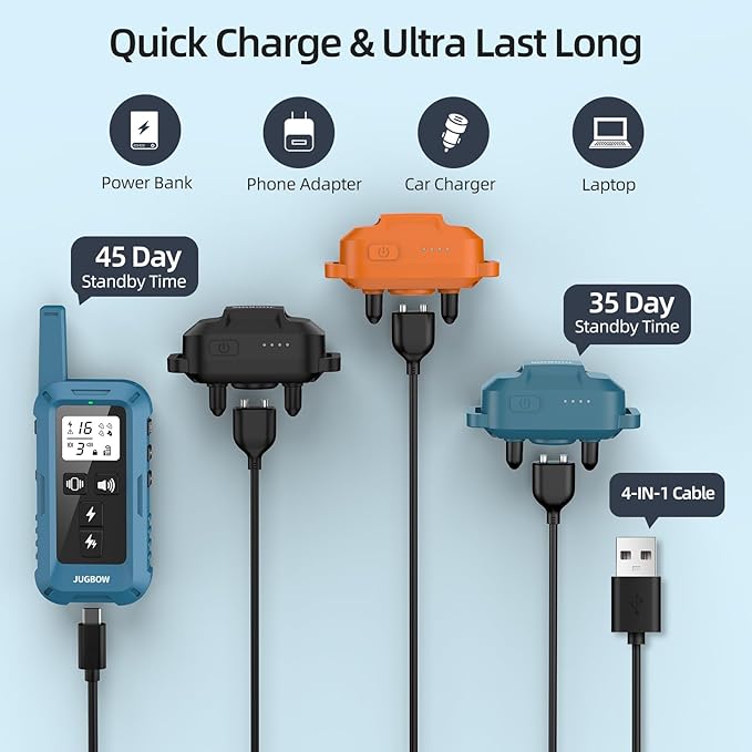- [Incredible Battery Life & Quick Charging] Charge 3 e-collars and the remote simultaneously in just 2 hours using the included 4-in-1 cable. You can enjoy extended battery life with up to 35 days of standby time for the collar and an impressive 45 days for the remote!