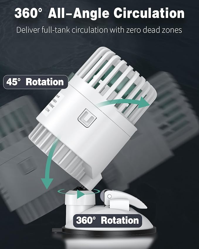 - 360° All-Angle Circulation: This aquarium wave maker rotates 360°on its base to deliver flow from all angles, ensuring full-tank circulation with no stagnant spots. Effectively prevent waste buildup to keep your tank clean