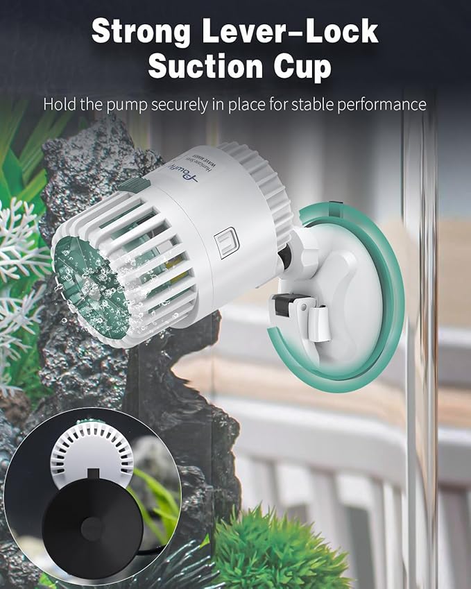 - Strong Suction Cup: Featuring a strong lever-lock suction cup base, this circulation pump stays firmly secured to any tank wall. Deliver consistent power that stirs the entire tank, mimicking turbulent sea waves and revitalizing your aquatic environment