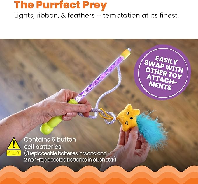 - Engaging Plush & Light-up Feather Toy Prey: Includes a fun plush star toy with light, feathers, and ribbon; ideal for stimulating chasing and hunting instincts for bat, swat, and pounce action; contains button cell batteries