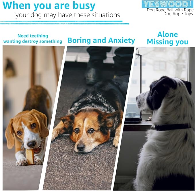 - 【Health & Play Benefits】This ball on rope dog toy is good for your pet to keep their teeth clean, suitable for puppy teething,naturally supporting your pup’s oral health - the fibers in the rope toy will slowly rub the dog's dental calculus off with dental floss. Two interactive toys can drain your dog's energy, keep your dog busy, train dog's behavior, and protect your furniture from your dog's chewing.
