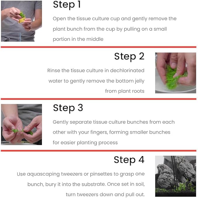 - Rinse gel, divide stems, and plant vertically with aquascaping tweezers.