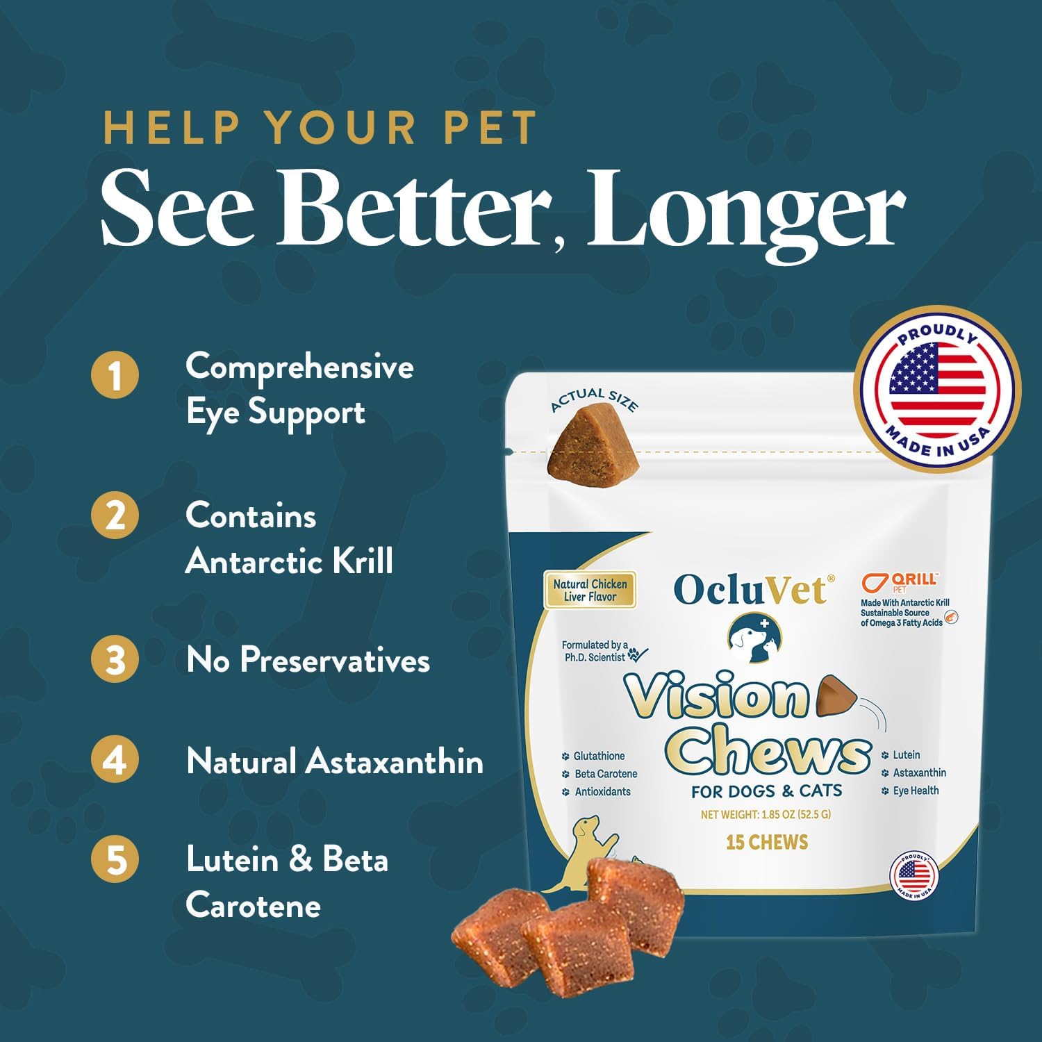 - Premium Ingredients: We use Qrill Pet and Antarctic Krill to give your pet the finest nature has to offer; Our dog vision supplement is packed with Omega-3s and Astaxanthin, ingredients that can help protect and nourish their eyes, while also caring for the planet!