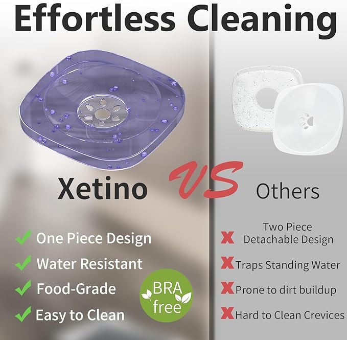 - Slow Water Feeder: The one-piece molded floating disk prevents leakage and dirt buildup. It slows down your pet’s drinking speed to avoid choking and keeps dust, dirt, and pet hair out for cleaner water.