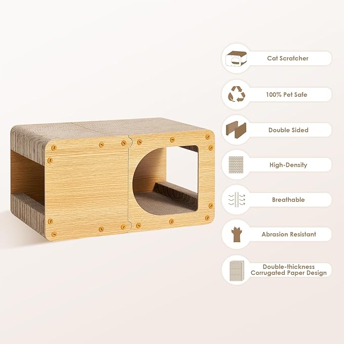 - 😺INNOVATIVE DESIGN: All sides of cat scratcher house available to scratch, it's a great new toy for any cats. Your cat can not only sharpen its claws but also fully relax, climb, play, and stretch.