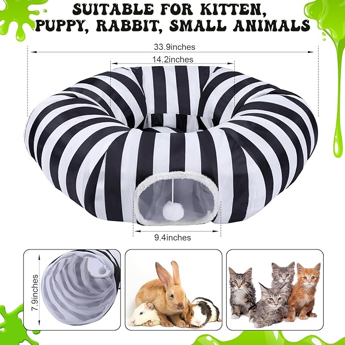 - Spooky Fun for Small Pets: the black and white striped Halloween cat donut tunnel, enhancing your home's spooky Halloween vibe; And with the size is 33.9 x 14.2 x 9.4 inch the Halloween cat tunnel ideal for kittens, guinea pigs, and rabbits to run, hide, and explore