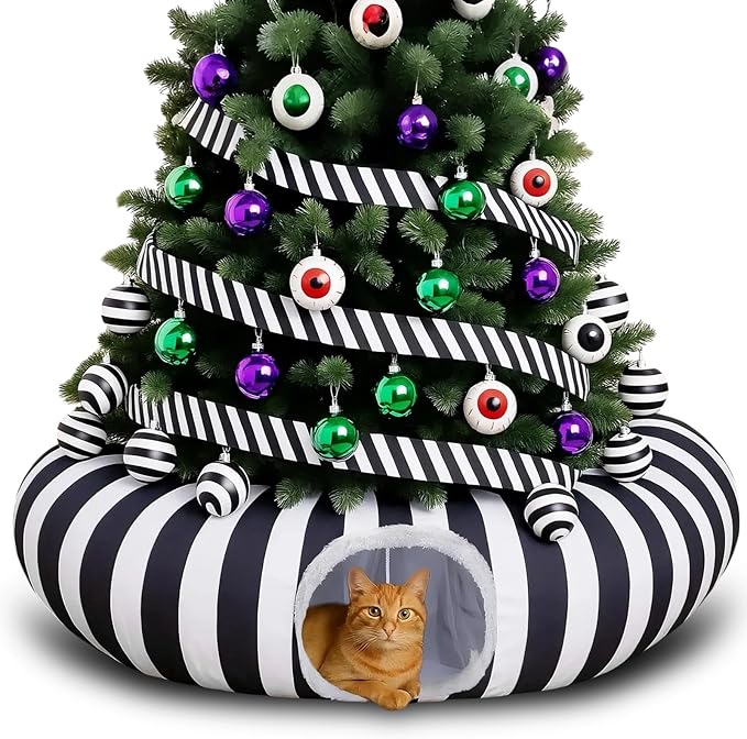 Frienda Cat Tunnel Bed Under Halloween Tree Sandworm Kitten Donut Tunnel with Cushion and Ball Toy Tree Skirt Detachable Black and White Stripes Cat Cave for Kitten, Puppy, Rabbit, Small Animals