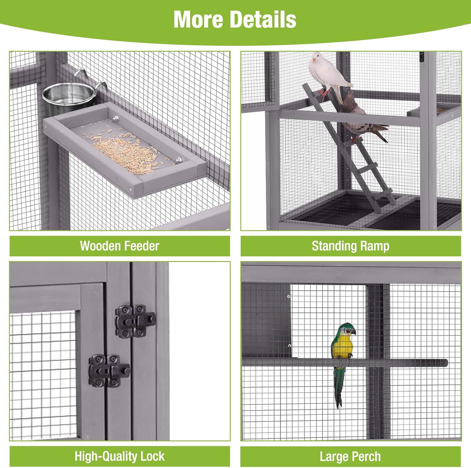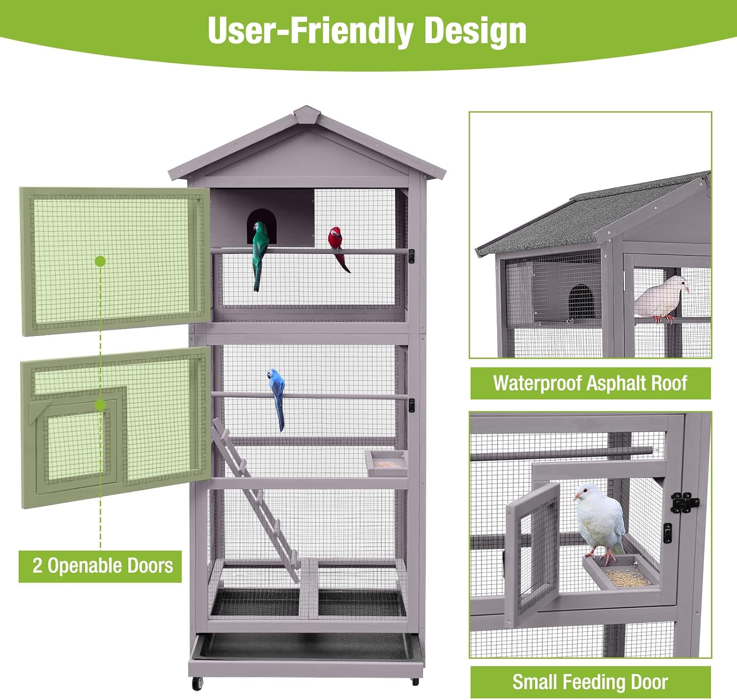GUTINNEEN Large Bird Cage Outdoor Wooden Aviary Indoor on Wheels, with Play Stand, Perches, Nest Habitat & Wire Mesh Tray for Easy Cleaning