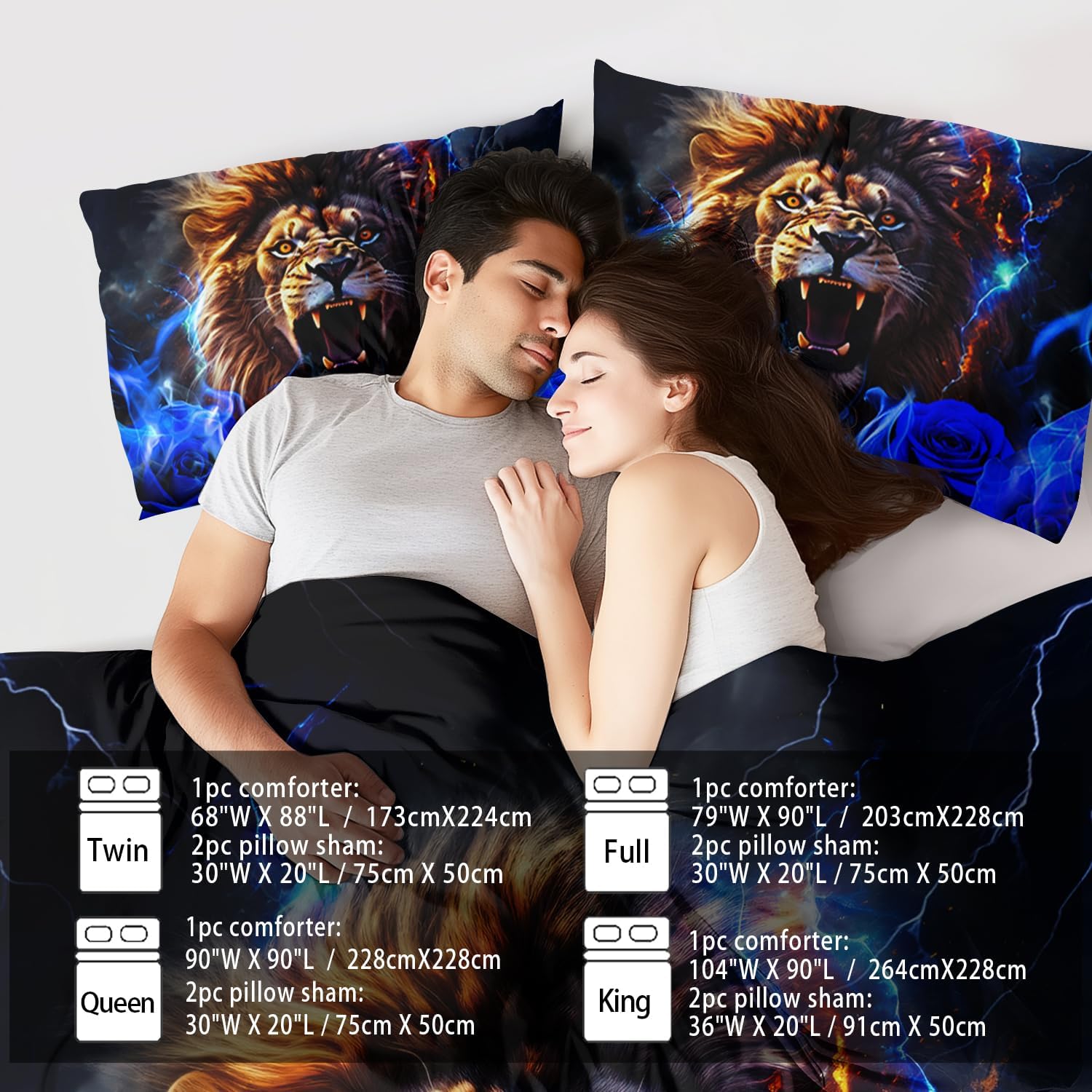 - Full Size Fashion Lion Comforter Set :This bedding set includes 1 comforter(67" x 85") and 2 pillowcases(20”x30”). In order to facilitate transportation, the quilt is made of vacuum compression technology. It will be slightly wrinkled when taken apart, but it will quickly regain its fluffiness if you gently beat it.