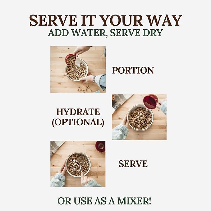 - Serve as a Meal or a Topper – Use as your dog’s complete meal or sprinkle over their usual food for added variety and taste. If using as a topper, reduce the amount of their current food to avoid overfeeding.