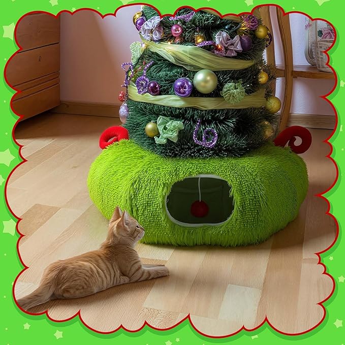 - Christmas Elf Look: this cat donut tunnel for Christmas tree is design with lime green color, 2 horns and a catch ball, full of elf-like atmosphere; The Christmas cat tunnel bed toy brings playful holiday cheer while giving cats a fun hideaway that keeps them away from your Christmas tree and decor