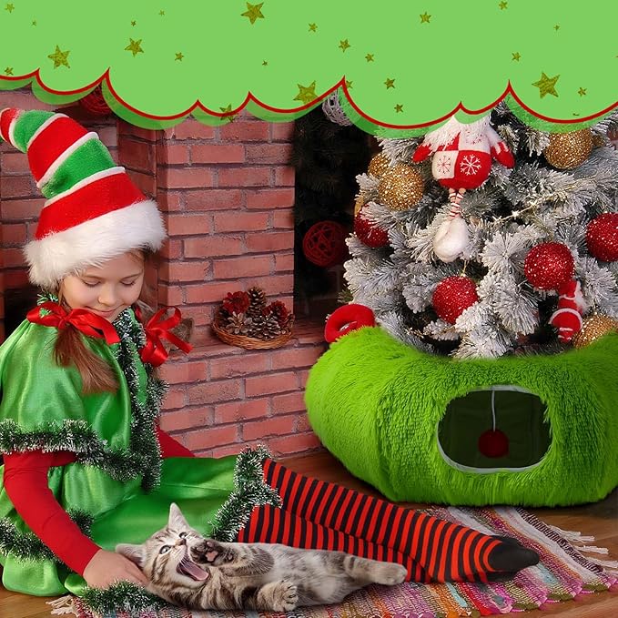 - Ideal Christmas Gift: easy to fold for storage or travel, this lime green Xmas kitty tunnel is not only Christmas tree skirt, offering a protective barrier to keep curious cats from climbing and damaging your holiday decorations, but also a fun Christmas gift for cat owners, adding seasonal cheer