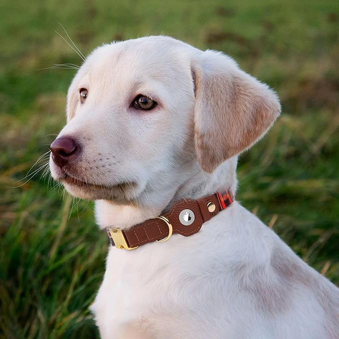 - Premium Materials – Made from genuine leather and lightweight printed nylon, this collar combines elegance with durability. It's comfortable for everyday wear and built to last. The AirTag collar also features a sturdy, easy-to-use one-click metal snap button.