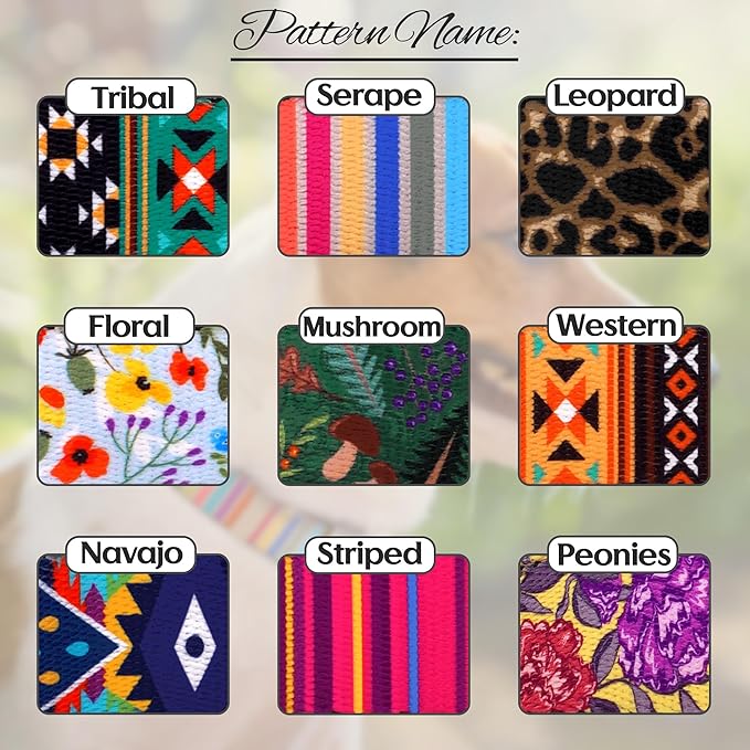 - 9 Unique Designer Styles – Each design features a different genuine leather color and matching metal hardware (gold, black, rose gold or silver). Choose from bold and playful patterns like: Tribal, Serape, Leopard, Floral, Mushroom, Western, Navajo, Striped, Peonies.