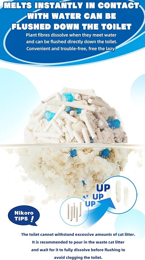 - Flushable Design: The flushable feature of Nikoro Mixed Cat Litter brings great convenience to the disposal of cat litter. When cleaning the litter box, just flush the clumped part into the toilet, without the need to laboriously classify and dispose of garbage. This not only saves time and effort but also reduces environmental pollution. At the same time, the flushable design also makes the use of Nikoro Mixed Cat Litter more economical and environmentally friendly, providing an ideal choice for owners who love the environment.