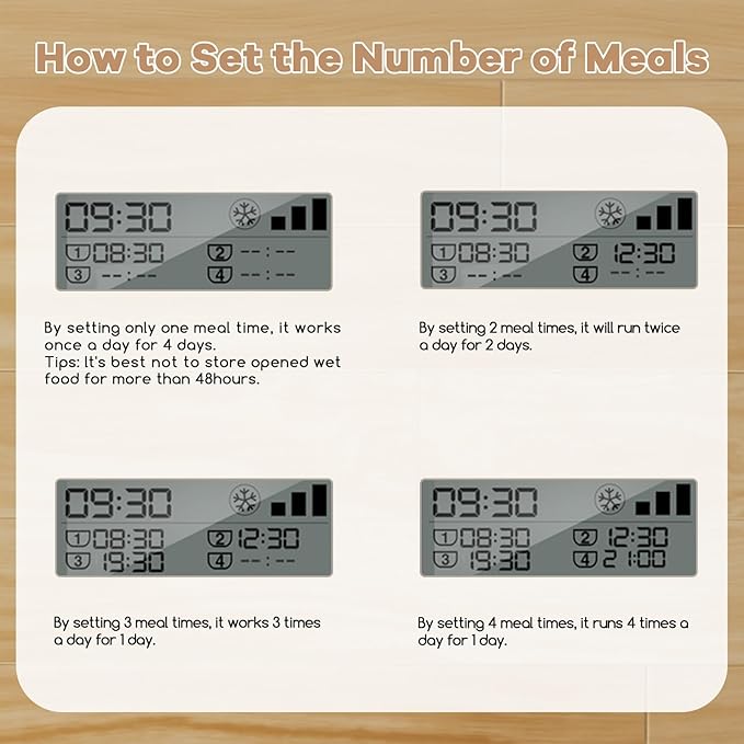 - Keep Wet Food Fresh for 1-4 Days: The automatic cat feeder for wet food uses advanced semiconductor cooling to preserve freshness with superior efficiency compared to ice packs. 3 cooling temperature settings keep food at 50 to 59°F, providing your pet with fresh food all day long. The automatic feeder keeps 5 meals refrigerated for up to 1 to 4 days, allowing you to go out without worrying about your pet's diet